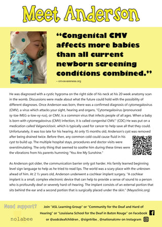 “Anderson was diagnosed with a cystic hygroma on the right side of his neck at our 20- week anatomy scan. At that point that told us he could have Downs, Turner syndrome, or Elephantiasis. They also brought up termination of the pregnancy because they didn’t think he would have quality of life. Once he was born, he was tested and it was then that they diagnosed him with cytomegalovirus, which is a virus that attacks your sight, hearing, and organs. He was put on valganciclovir (cancer medicine) that helps the white blood cells. It saved his sight and organs, but it was too late for his hearing.